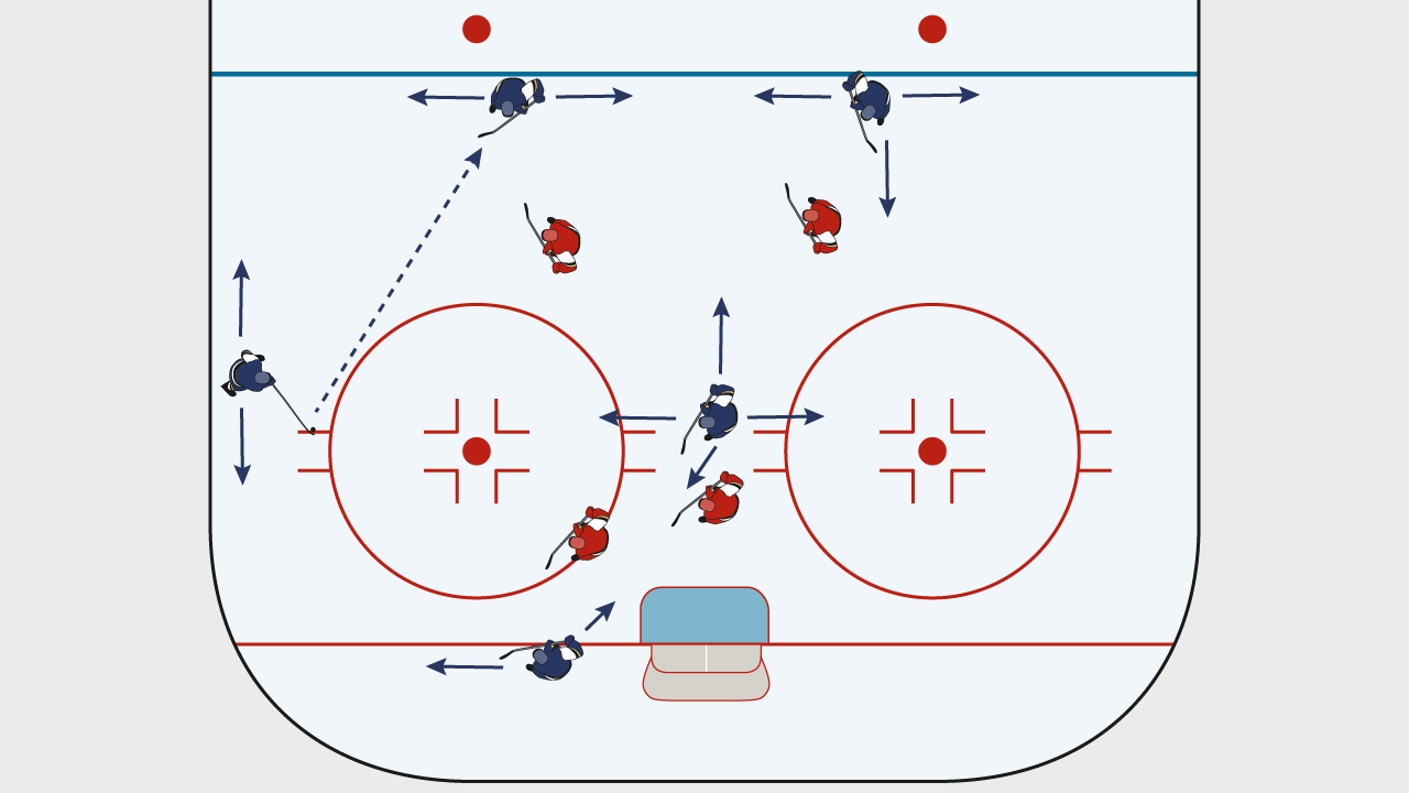Die Spieler sollten eine Grundaufstellung in ÜZ kennengelernt haben. Wichtig in ÜZ ist, dass die Spieler anspielbar sind und für den Puckführenden Anspielstationen schaffen. Dabei sollten 1-1-Situationen vermieden werden.